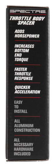 Manufactured from high quality machine finished aluminum, Spectre's Throttle Body Spacers are engineered to improve engine performance. By providing added volume to the intake manifold and directing air through a tapered internal constriction, this spacer utilizes the Venturi effect to increase the speed of air flowing into your intake manifold. Spectre has designed a number of kits to fit a wide range of specific applications. Each kit includes the necessary gaskets and hardware to bolt directly to the factory components, making installation quick and easy.