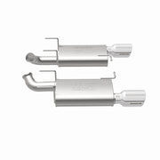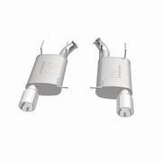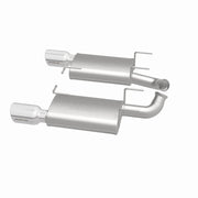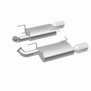The MagnaFlow 2011-2012 Ford Mustang Street Series Axle-Back Performance Exhaust System 15595 brings enhanced engine sound and dyno-proven performance to your 3.7L 2011-2012 Ford Mustang with a healthy helping of our deep, resonant signature exhaust note at Moderate exterior and Mild interior sound levels. Thanks to its durable, corrosion resistant stainless steel design, this Ford Mustang exhaust system will handle whatever tarmac you decide to leave your mark on. This performance exhaust kit features an axle-back layout designed to replace your Ford Mustang's exhaust system from near the rear axle on back. With its fast-flowing, mandrel bent 2.5in. main piping and 2 Straight-Through mufflers ending in a Dual Split Rear exit with 4in. Polished Welded-On Double Wall Angle Cut Rolled Edge tips, your ride will be sounding as awesome as it looks. Extensive 3D scanning during development has resulted in a direct-fit design that you can easily install yourself. 15595 is produced using CNC precision robotic manufacturing techniques and is backed by MagnaFlow's 1-year limited finish warranty and limited lifetime construction warranty.