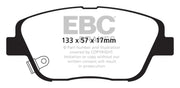 There are TWO reasons our customers love Redstuff, First because they are the lowest dust pad we have encountered by reducing dust by 60-90-percent. Plus the minimal dust you see is very easily removed with a simple sponge wash as it contains no steel fibre particles as in ALL OTHER pads. Second they brake like an alligator right from cold (as good as Original pads or better) and just get better as they heat up.This material is a Synthetic Fiber based brake compound enhanced with ceramic particles. If you have previously tried EBC redstuff (pre-ceramic compound) this material is light years ahead. It lasts longer; it brakes better and is quieter. Being a hard wearing pad, bed-in times can be as long as 1000 miles and drivers must be patient until the pad takes up the shape of their disc (brake rotor). This is a truly impressive fast road pad for repeated heavy braking.It emits far less dust than semi-metallic pads and has been proven to stop a passenger car/sedan/sport compact/hot hatch 13 metres quicker than OEM pads from 100mph/160kph. Features EBC Brake-In surface coating which conditions rotor surface and accelerates pad bed-in. Nominal friction coefficient 0.5 with approx. 50-percent dust reduction.Most EBC Red Ceramic pads are approved to ECE R90 brake safety regulation.