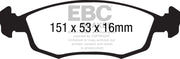 Designed for premium street driving offering better brake effect up to 600-degrees C (1100-degrees F). EBC Greenstuff has a high initial brake effect and gives drivers confidence from first application of the brake pedal. There is no such thing as a NO DUST pad. The very nature of how a brake works requires that some dust be generated to avoid rotor vibration (shimmying). The EBC pad creates less dust and dust is more easily washed off than most. All pads create more dust as they are bedding in especially if rotors are worn. Nominal friction coefficient 0.55. For heavier faster cars and vehicles above 200bhp we strongly recommend Redstuff which DOES offer much less dust.