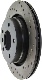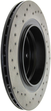 StopTech Drilled Sport Rotors are 1-piece direct replacement brake discs for factory brake systems and stock calipers that look great behind your wheels – and offer significantly improved braking performance. The unique cross-drilling aids with heat and brake dust dispersal; prevents glazing of the pads; adds bite and improves wet and dry braking performance. Built to last; the black e-coating provides protection from corrosion and the high carbon metallurgy (in most applications) offers quieter operation; better crack resistance and increased performance.