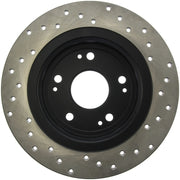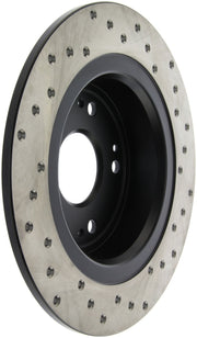 StopTech Drilled Sport Rotors are 1-piece direct replacement brake discs for factory brake systems and stock calipers that look great behind your wheels – and offer significantly improved braking performance. The unique cross-drilling aids with heat and brake dust dispersal; prevents glazing of the pads; adds bite and improves wet and dry braking performance. Built to last; the black e-coating provides protection from corrosion and the high carbon metallurgy (in most applications) offers quieter operation; better crack resistance and increased performance.