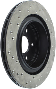 StopTech Drilled Sport Rotors are 1-piece direct replacement brake discs for factory brake systems and stock calipers that look great behind your wheels – and offer significantly improved braking performance. The unique cross-drilling aids with heat and brake dust dispersal; prevents glazing of the pads; adds bite and improves wet and dry braking performance. Built to last; the black e-coating provides protection from corrosion and the high carbon metallurgy (in most applications) offers quieter operation; better crack resistance and increased performance.