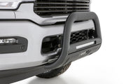 Protects your front end from flying debris with 3.5 inches of oval steel tubing. These bull bars also boost your visibility with an integrated 20 in. LED light bar. The included heavy duty light bar illuminates your night driving with a bright flood beam pattern and is easily wired into your factory light wiring, or a wiring harness can be purchased separately. Available in black textured powder coat or polished T304 stainless steel finish. Our popular LUND bull bars may now be ordered with a wire harness kit. The wire harness kit is also sold separately for lighting and accessories up to 30 Amps. LUND's bull bars with LED light bar and wiring kit is the total package to see and be seen, providing complete front end style, lighting and protection.