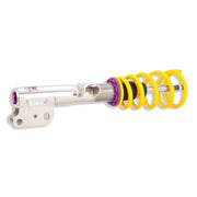 Cutting-edge motorsports technology for more performance on the road. Like every suspension product developed by KW automotive, the suspension manufacturer, and manufactured in Germany, the KW V3 Coilover suspension kit also provides a significant plus in safety reserves in road traffic. Thanks to the chassis with its high-quality dampers, springs, and elastomer spring elements, pitching and rolling movements during load changes such as evasive maneuvers, cornering, acceleration, and braking are significantly reduced. The braking distances are also shortened. Thanks to improved support and feedback, drivers not only feel safer but driving in everyday life becomes even safer. With compression and rebound stage damping, that can be set separately and independently of each other, the damper setup can be customized to your personal driving preferences or vehicle changes such as weight, tire characteristics, or altered vehicle rigidity. True performance optimization is only possible with this unique, patented system. For example, this allows the compression damping force to be increased and get more grip from the tires, to improve cornering behavior and reduce squat without simultaneously altering the rebound stage damping which is optimally matched to the spring rate, a scenario which results in reduced grip and the associated loss of performance. The KW V3 coilover kit is the ideal tool for performance-oriented drivers and experienced tuning enthusiasts who place a strong emphasis on the overall performance of their suspension. The Variant 3 features patented TVR-A and TVC-A technology that provides separately adjustable rebound and compression damping. The extensive adjustment range of the independently configurable rebound and compression make it easy to directly influence the steering behavior, directional stability, grip and handling characteristics for confident and repeatable results at the limit of driving dynamics.