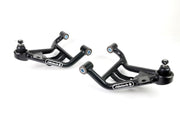 This bolt-in SLA (Short-Long-Arm) suspension system replaces the McPherson strut design with a billet aluminum upper control arm, tubular lower arm and spindles with S-550 Mustang hub's. This design greatly improves negative camber gain and overall suspension geometry. Available with either Ridetech Coil-Overs or Shockwave air suspension. (Sold separately)The factory strut design offers very little camber gain and poor overall geometry. This design incorporates an upper control arm to induce negative camber gain. This positions the tire perpendicular to the pavement through the corners without the need for excessive static camber. Caster, roll center and Ackerman angles were also optimized.The bolt-in frame surrounds create attachment points for the upper control arms and the shocks, this keeps all of the load on the frame rails. The upper and lower arms feature Delrin bushings to minimize stiction. The spindles utilize S550 Mustang hubs to prevent flex and are compatible with S550 or SN-95 Mustang brakes. (Sold separately)Camber gain is 1.25 deg./inch. Positive caster setting from 7-9 degree's. Bumpsteer is nearly eliminated, under .050". Tire clearance improved on lower arm to allow 30 degree’s of steering angle with up to a 275mm wide tire (minimum 17"). This system is compatible with the stock sway bar or most aftermarket sway bars. This system will fit most aftermarket k-members including Maximum Motorsports, Team Z, AJE and UPR.