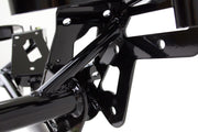 Less weight plus high strength equals road race and auto-x success. UMI’s direct bolt-in replacement Road Race K-member instantly removes 20 lbs of front end weight from your ride and helps your existing horsepower work for you while providing a capable, high strength foundation. UMI’s RR k-member features strong dual tube construction as well as extra tubing and gusseting in critical areas. The K-member is fabricated from CNC machined 3/16” thick mild steel held together by a strong dual tube lower section. Factory clamshell and engine mounts bolt to the precision machined mounting pads while both factory and aftermarket suspension is located by strong boxed mounting points. Lightening holes are CNC machined into the mounting plates and the tubular construction provides added clearance for aftermarket exhaust. The modular design permits stock spring and strut use or simply remove the spring pockets and convert to coil-overs. Street and track testing on our test car has shown this K-member to be strong, reliable and a great upgrade for your high performance ride. Available in tough powder coated red or black finish. Manufactured with pride in Philipsburg, PA - USA