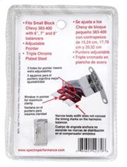 Spectre's Timing Tab Adjustable Small Block Chevy is a universal timing tab that has an adjustable pointer for accurate readings and works with any size harmonic balancer. Featuring triple chrome plated steel construction, the timing tab fits small block Chevrolet 265-400.