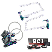 The ColorSHIFT(tm) Halo Kit can produce any color including whites from 3000K-15000K with the push of a button. This allows the user to dial-in the exact color rings that they desire. These 3-Chip 5050 SMD rings are BRIGHT, and for some they may be too bright, that is why (for the first time) the user has full control over the ring brightness. ORACLE SMD or "Surface Mount Diode" Halos utilize an advanced type of LED chip that can produce brilliant light output while only consuming a small amount of power. The SMD chips are installed onto a CAD designed 6-layer PCB (Printed Circuit Board) which is very sturdy and will not break if pressured. The PCB can easily be mounted to a headlight housing using the pre-installed 3M adhesive tape backing. The new BC1 ColorSHIFT(tm) controller is a robust and rugged Bluetooth option that is easy to install and a low price. Perfect for adding ORACLE ColorSHIFT(tm) products to your vehicle, simply connect power and ground then connect your smartphone through the free app to control. The controller features 4 outputs with waterproof connections for easy wiring to your ColorSHIFT(tm) lighting products. Through the app you can turn your lights on and off, select from millions of color variations, control patterns, brightness, strobe function, and even control the lights with music