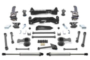 Fabtech's FJ system features extended length steering knuckles attaching to one piece lower control arm crossmembers for a full 6 inches of lift to clear 35in tires. Front lower crossmembers feature adjustable alignment cams along with an integrated 1/4'' thick steel differential skid plate. The Basic system retains the front strut assembly for a smooth highway ride with ease of installation. The rear suspension system includes tubular upper and lower link arms, utilizing the stock rear coil springs for a supple highway ride with excellent offroad articulation. Installation does not require relocation of the Rack and Pinion or disassembly of the front strut assemblies. The stock front and rear driveshafts are retained due to Fabtech's precise suspension geometry. Includes rear 2.25 Dirt Logic Stainless Steel shocks.