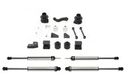 Fabtech offers the 3'' Basic system. This system utilizes the factory coil springs with 3'' steel coil spacers. With the vast array of cab and motor combinations found in the JK, utilization of the factory coil springs with this system ensures that the vehicle will receive a full 3'' of lift to clear 35/1250R17 tires. This system includes a replacement Pitman Arm, front and rear Trac Bar relocation brackets, Sway Bar Links, front and rear Bump Stop mounts, gusset kit and more. Proper front end alignment is insured with this system due to the included adjustable alignment cams. Also included is a front driveshaft boot clamp kit to allow additional clearance between the front driveshaft and transmission during full suspension articulation. This system capitalizes on Jeep's very capable factory suspension design with the benefit of additional wheelwell clearance to run 35'' tall tires for all around on and offroad performance. As an alternative to the factory small CV driveshafts we offer Heavy Duty units featuring large 1310 U-joints for increased strength. These driveshafts will directly replace the factory assemblies for use with the 3'' Basic System. Includes front and rear 2.25 Dirt Logic Stainless Steel shocks.