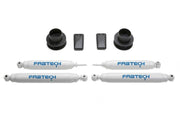 The 2.5in Lift system for 2014 3500 Rams, with factory Radius Arm front suspension, features more than just basic spacers. Dodge designed the front coil springs with a large bow to increase vehicle stability and handling. Unlike other flat spacers on the market, Fabtech's angled spacers retain this important feature preserving the factory ride characteristics. The front shocks are replaced with longer length Fabtech Performance twin tube shocks to allow for full suspension travel while improving the damping of the front suspension. Extended length bump stops are included in this kit to prevent the coil springs from binding at full compression while also eliminating Trac Bar interference. Optional rear shocks are available separately. This kit can be removed to return the vehicle to stock. Estimated installation time - 1.5 hrs. No drilling or welding required.