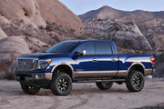 This 6" Basic system for the Nissan Titan features Fabtech's proven IFS technology with extended length ductile iron steering knuckles for proper factory electronic stability control functionality. Heavy duty 1/4" thick steel lower control arm crossmembers provide superior ground clearance while the integrated front differential skid plate adds protection to the drivetrain. Rear lift is accomplished with a block and u bolt configuration. The Basic System includes front coilover spacers that utilize the factory Coilover shocks for a stock like ride characteristic.
