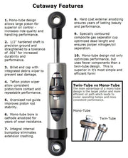 Front HQ Shock Absorber with 5.25" stroke with stud/stud mounting. Includes 1 rebound adjustable shock. 8.55" x 13.8" with a 11.25"-11.75" ride height.
