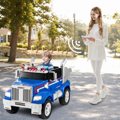 Blue 12V Licensed Freightliner Kids Ride On Truck with Dump Box and Lights