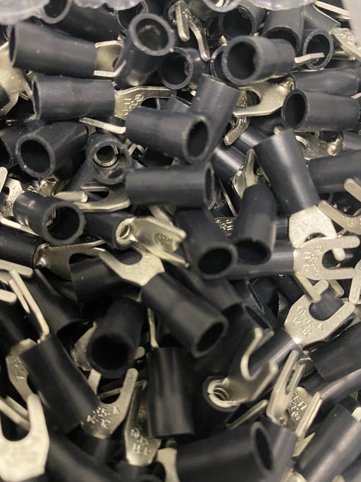 14-12 GA BLACK FORK SPADE TERMINAL VINYL INSULATED CRIMP WIRE CONNECTORYOU CHOOSE THE PACK SIZE AND THE STUD SIZE:Max current:37AContact Material:C...