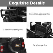 The 12V Electric Kids Ride On Jeep Car with Remote Control - Perfect for Little Adventurers! is designed to provide endless fun and excitement for your little ones. With its sleek and stylish design, this ride-on car is perfect for kids who love adventure and exploration. Whether they want to go on a thrilling off-road adventure or simply cruise around the neighborhood, this rc ride on car is sure to provide hours of entertainment.Key Features:- 2 wide seats: This ride-on car can accommodate 2 kids at a time, allowing them to share the driving fun together.- Shock absorber spring: The ride-on car is equipped with a shock absorber spring to minimize the shock feeling and ensure a smooth driving experience.- Soft start and stop: The soft start and stop feature protects kids from any danger caused by excessive speed, ensuring their safety while they enjoy their ride.- 2.4G remote control: The ride-on car comes with a 2.4G remote control that allows parents to control the moving direction and choose from 3 variable modes, giving them peace of mind and control over their child's ride.- Ample storage space: The ride-on car features a back storage box and a front engine that provide ample storage space for toys and other belongings when kids go outside to play.Product Specifications:- Brand: Topbuy- Material: PP+ Iron- Voltage: 12V- Seats: 2- Remote Control: 2.4G- Speed: 3-5 km/h- Charging Time: 8-12 hours- Run Time: 1-2 hours- Weight Capacity: 66 lbs- Recommended Age: 3-8 years oldWith its impressive features and specifications, the 12V Electric Kids Ride On Jeep Car with Remote Control is the perfect choice for little adventurers. Let their imaginations run wild as they embark on exciting journeys with this ride-on car. Order yours today and watch as your kids create unforgettable memories of fun and adventure.