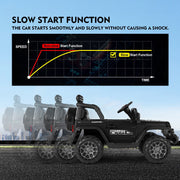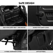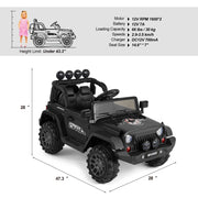 The 12V Electric Ride-On Jeep for Kids with LED Lights, Music, and Bluetooth Remote Control Introducing our new fantastic and functional ride-on car for your lovely children. This 12V Electric Ride-On Jeep is designed to provide an exhilarating driving experience for kids ages over 3 years. Equipped with a 2.4G remote control, parents can also enjoy the thrill of driving their children around. The comfortable seat and MP3 aux create an enjoyable environment for your children during playtime. With its 4-Wheels and spring suspension system, seat belt, and double lockable door design, this remote control ride on car ensures a comfortable and safe ride for your kids. It's the ideal gift for both outdoor and indoor adventures. Key Features: TWO MODES TO OPERATE - Kids can operate the electric car themselves through pedals and steering wheel to enjoy the 2 different speeds. Parents can control the car through the 2.4GHz remote control with three speeds. MULTIPLE AND JOYFUL FUNCTIONS - The built-in AUX port, USB, TF slot, music, and story, Bluetooth make your child's driving journey more enjoyable. SAFETY AND COMFORT - The slow start function reduces the impact of sudden acceleration on children. The door with safety lock and the seat with safety belt ensure the utmost safety and comfort for your child. DURABLE AND PORTABLE DESIGN - Made of non-toxic PP and iron, this electric vehicle is built to last. The wheels with a spring suspension system are suitable for all kinds of roads. The luggage handle allows for easy transportation. PERFECT GIFT - With a 12V7AH large-capacity battery, overcharge and overload protection, and 2 powerful motors, this ride-on car is a wonderful present for your child's birthday and Christmas. Product Specifications: Color: Black Battery: 12V7AH Charger: 12V700mA Motor: 390-16000*2 Play Time: 1-2 hours Loading Capacity: 66 lbs Speed: 2.9-3.5 km/h Size: 47''x28''x28'' Height Limit: 43.3'' Package Content: 1 x Electronic Toy Car 1 x Hardware Bag 1 x Manual Instruction 1 x Bluetooth Remote Control