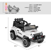 The 12V Electric Ride On Truck for Kids with Storage, LED Lights, MP3 Player, Bluetooth, and Remote Control - White Introducing our new and fantastic 12V Electric Ride On Truck for Kids with Storage, LED Lights, MP3 Player, Bluetooth, and Remote Control. This functional and stylish ride-on truck is perfect for your lovely children, providing them with endless hours of fun and adventure. It is ideal for children ages over 3 years and equally enjoyable for parents who can use the 2.4G remote control to drive their children around. The comfortable seat and MP3 aux create a delightful environment for your children while playing. With its 4-Wheels with spring suspension system, seat belt, and double lockable door design, this rc ride on truck offers a comfortable and safe ride for your kids, making it the perfect gift for both outdoor and indoor playtime. Key Features: TWO MODES TO OPERATE - Kids can operate the electric truck themselves through pedals and steering wheel, enjoying the thrill of driving at two different speeds. Parents can also take control of the truck using the 2.4GHz remote control, which offers three different speeds. The battery allows for 1-2 hours of playtime after a full charge. MULTIPLE AND JOYFUL FUNCTIONS - The built-in AUX port, USB, TF slot, music, and story options, as well as Bluetooth connectivity, enhance your child's driving journey, making it more enjoyable and entertaining. The high-bright LED lights add a cool factor, making your child feel super cool when driving at night. SAFETY AND COMFORT - The slow start function reduces the impact of sudden acceleration on children, ensuring a smooth and safe ride. The door with safety lock and the seat with safety belt provide maximum safety and comfort for your child. Additionally, the rear tire can be used as extra storage space for toys, snacks, and more. DURABLE AND PORTABLE DESIGN - Made of non-toxic PP and iron, this electric ride-on truck is built to last. The wheels with a spring suspension system are suitable for all kinds of roads, including asphalt, brick, and cement. The luggage handle makes it easier to transport the truck outdoors. PERFECT GIFT - The 12V7AH large-capacity battery with overcharge and overload protection, along with the 2 powerful motors, ensures a thrilling and long-lasting ride. The truck's size is 47"(L) x 28"(W) x 28"(H), with a weight capacity of 66 lbs. It has a speed range of 2.9-3.5 KM/h. The JOYLDIAS kids ride-on truck is a wonderful present for your children's birthday and Christmas. Product Specifications: Color: White Battery: 12V7AH Charger: 12V700mA Motor: 390-16000*2 Play Time: 1-2 hours Loading Capacity: 66 lbs Speed: 2.9-3.5 km/h Size: 47''x28''x28'' Height Limit: 43.3'' Additional Specifications: Brand: JOYLDIAS Year: 2022 Custom Bundle: No Theme: Trucks Age Level: 3-4 Years, 4-7 Modified Item: No Package Content: 1 x Electronic Toy Car 1 x Hardware Bag 1 x Manual Instruction 1 x Bluetooth Remote Control