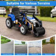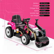 The 12V Electric Tractor with Remote Control, Music, and LED Lights for Kids is available in four vibrant colors: Blue, Pink, Red, and Yellow. Crafted with premium PP and steel materials, this ride-on car features a lifelike road roller appearance, allowing children to immerse themselves in imaginative role-playing fun. The adjustable arm and flexible drum roller add to the excitement and creativity of playtime.Equipped with high/low speed and forward/reverse shifting, this rc ride on truck provides a realistic driving experience for your little one. The one-key start, foot pedal, and steering wheel make it easy for children to operate the vehicle. It offers two driving modes: manual operation by the child and parental remote control for added safety and peace of mind.Rest assured, this 12V battery-powered construction vehicle meets ASTM and CPSIA certification standards, ensuring its durability and safety. The ergonomic backrest and wide seat provide optimal comfort, while the adjustable safety belt and side handrails offer added security during playtime.To enhance the driving experience, this ride-on road roller is equipped with built-in music, a horn, and startup sound effects. Children can also enjoy their favorite tunes through the USB port and wireless connection. The bright LED headlights not only illuminate the path but also add a cool factor to nighttime adventures.The non-slip and wear-resistant wheels enable smooth and safe driving on various terrains. With a weight capacity of 66 lbs, this ride-on toy is suitable for children aged 3-8 years. The overall dimensions of the car are 49" x 20" x 21" (L x W x H), and it weighs 27.5 lbs.The 12V Electric Tractor with Remote Control, Music, and LED Lights for Kids comes with a 12V 7AH battery that requires 8-12 hours of recharge time. The remote control operates on 2 x 1.5V AAA batteries (not included). The package includes the ride-on road roller, a 2.4G remote control, a charger, and an instruction manual.This modern and exciting ride-on toy is the perfect gift for young boys and girls who love adventure and pretend play. Let their imaginations run wild as they take control of their very own road roller. Assembly is required, but with its easy-to-follow instructions, you'll have it up and running in no time.Specifications:- Color: Blue/Pink/Red/Yellow- Material: PP, Steel- Overall Dimension: 49" x 20" x 21" (L x W x H)- Net Weight: 27.5 lbs- Weight Capacity: 66 lbs- Suitable Age: 3-8 Years- Max Speed: 2-5 mph (3-8 km/h)- Recharge Time: 8-12 Hours- Battery: 12V 7AH- Battery Type of the Remote Control: 2 x 1.5V AAA Battery (Not Included)Package Includes:- 1 x 12V Kids Ride on Road Roller- 1 x 2.4G Remote Control- 1 x Charger- 1 x Instruction Manual