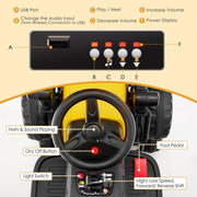 The 12V Electric Tractor with Remote Control, Music & LED Lights - Perfect for Kids to Ride On! is not just any ordinary ride-on toy. It is a realistic road roller that will bring your child's construction dreams to life. With its adjustable arm and flexible drum roller, this remote control ride on toy operates just like a real construction vehicle, allowing your little engineer to even out the ground and have endless hours of driving fun.This 12V battery-powered construction vehicle offers both manual and parental control. Your child can operate the road roller themselves using the foot pedal, steering wheel, and high/low speed and forward/reverse shift lever. But don't worry, parents can also take control of the vehicle using the remote control, ensuring a safe and enjoyable time for everyone.Safety and comfort are of utmost importance, which is why this electric vehicle for kids is ASTM and CPSIA certified. Made with durable PP and steel material, it guarantees safe use and a long service life. The high backrest, wide seat, adjustable safety belt, and side handrails provide maximum safety and comfort for your child. The soft start function also protects them from sudden impact, giving them a smooth and enjoyable driving experience.But the fun doesn't stop there! This ride-on tractor is packed with multiple built-in features to enhance the driving experience. It comes with a horn, startup sound, music, USB port, wireless connection, and bright LED headlights. Your child can even adjust the volume according to their preference. Let them immerse themselves in a realistic driving experience and endless fun.No terrain is too tough for this ride-on road roller. Equipped with 4 inflation-free wheels with anti-slip texture, it can handle various grounds such as cement road, asphalt road, brick road, and boardwalk. The wear-resistant wheels ensure that this toy will serve your child for many years to come.Now, let's talk about the specifics:- Color: Yellow- Material: PP + Steel- Overall dimension: 49" x 20" x 21" (L x W x H)- Net weight: 27.5 lbs- Weight capacity: 66 lbs- Suitable age: 3-8 Years- Max speed: 2-5 mph- Recharge time: 8-12 Hours- Battery: 12V 7AH- Battery type of the remote control: 2 x 1.5V AAA Battery (Not Included)With its realistic appearance, adjustable features, safety measures, and endless fun, this ride-on road roller is the perfect gift for 3-8 year old boys and girls. Let their imagination run wild as they embark on exciting construction adventures. Get ready for a ride-on experience like no other!