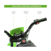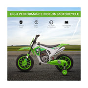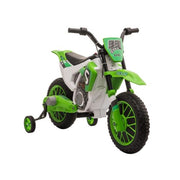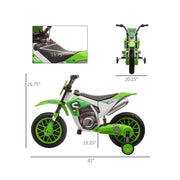 The 12V Kids Electric Dirt Bike Ride-On Toy by Aosom - Battery-Powered Off-Road Fun! is the perfect toy for your little adventurer. This brand new Aosom ride-on toy is designed to provide hours of fun and excitement for your child. With its cool style and realistic features, this electric dirt bike will make your child feel like they're riding a real motorcycle. But this ride-on toy is not just about fun - it also helps develop coordination, balance, and confidence behind the wheel from an early age. Your little one will love the feeling of independence as they zoom around on this electric dirt bike. The 12V Kids Electric Dirt Bike Ride-On Toy features a rechargeable 12V battery-powered rear-wheel drive. With adjustable speeds from 2 to 5 mph, your child can ride at a comfortable and safe speed. The bike is easy to control with a simple switch on the handle, just like a real ATV. This ride-on toy is built to last, with a maximum weight capacity of 66 lbs. It is suitable for children aged 3-5 years. The overall dimensions of the bike are 42" L x 20.25" W x 26.75" H. It is certified to meet safety standards including ASTM F963, CPSIA, UL, MSDS, and SOR. The 12V Kids Electric Dirt Bike Ride-On Toy is available in a vibrant green color that your child will love. It comes with a charging battery and training wheels for added stability. Key Features:- Rechargeable 12V battery-powered rear-wheel drive- Adjustable speeds from 2 to 5 mph- Easy-to-use switch on the handle- Develops coordination, balance, and confidence- Maximum weight capacity of 66 lbs- Suitable for children aged 3-5 years- Vibrant green colorProduct Specifications:- Brand: Aosom- Color: Green- Overall Dimensions: 42" L x 20.25" W x 26.75" H- Weight Capacity: 66 lbs- Suitable Age: 3-5 Years- Certification: ASTM F963, CPSIA, UL, MSDS, SOR- EAN: 0842525159500Get ready for off-road adventures with the 12V Kids Electric Dirt Bike Ride-On Toy by Aosom. Order yours today and watch your child's face light up with joy!