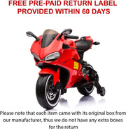 12V Kids Motorcycle Ride-On Toy with 4 MPH Speed and ASTM Approval An ideal kids motorcycle ride-on toy for beginners! Get your kids to be little motorcycle drivers cruising in the parking lot, playground, or your backyard when riding our unique FRP power wheels motorcycle! Let riding the FRP 12V Kids Motorcycle be a memorable impression and experience in your kids' happy childhood! The FRP 12V Kids Motorcycle Ride-On Toy is very popular among kids from 3-8 years old (under adult supervision), supporting up to 66 lbs. The motorcycles for kids have two racing modes, forward and reverse. Kids can have much fun on this big toy with the forward speed up to 4 mph and the reverse speed up to 2 mph. Great Birthday Gift, Thanksgiving Gift, or Christmas Gift for your kids, so the excitement and performance experience that watching cartoons cannot provide can bring your kids tons of adventure memories. Please use it under instruction and supervision! Please note, this is for enjoyment in private properties only. Safe With Lots of Fun! The FRP 12V kids motorcycle comes with a variable and safe speed throttle control. You do not have to worry about the speed that will be too fast for kids from 3-8 years old. The forward speed is up to 4 mph and the reverse speed is up to 2 mph. Your kids will definitely be excited while riding our motorcycle for kids! Beginner-Friendly Kids Motorcycle No worries! This is an ideal beginner-friendly kids motorcycle! With dual training wheels, your kids will be well-balanced while cruising around the parking lot, playground, and backyard and little garden outside your house! NOTE: Please use it under instruction and adult supervision! Beautiful Melody Along With Riding Feeling bored while riding? With Bluetooth, MP3 AUX, and Micro SD card, you can instantly connect your music device with the FRP 12V kids motorcycle. Imagine how your kids will enjoy this little journey with beautiful melody while riding on their kids motorcycle! Cool LED Light Design Filled in Wheels Your kids can be the coolest ones in the street! With the LED light design filled in two wheels, not only will the kids be satisfied with being the center of attention in the neighborhood, but you will also be able to see your kids under your supervision when it is getting darker in the afternoon. Check our most popular colors among kids! The color blue feels like a cool breeze touching the skin. Blues are more easily visualized through chilling! Enjoy the visual feast while riding on the FRP power wheels motorcycle! Check our most popular colors among kids! The color red feels like energetic love. This will bring a sense of embrace of love while riding on red! Enjoy the visual feast while riding on the FRP power wheels motorcycle! Check our most popular colors among kids! Pink can also remind you of earlier childhood memories! Most girls love pink! It relates to unconditional love and understanding, and the giving and receiving of nurturing. Enjoy the visual feast while riding on the FRP power wheels motorcycle! Check our most popular colors among kids! As one of the most common colors around us, green gets us more attention to be close to life and nature! Be fresh and energetic while riding in the bright green, and feel the sunny day! Enjoy the visual feast while riding on the FRP power wheels motorcycle! Product Specifications Battery: 12V SLV Battery Race Modes: Forward & Reverse Forward Speed: Up to 4 Mph Reverse Speed: Up to 2 Mph Acceleration/Braking System: Soft start & electric brake system Recommended Charging Time: 6 Hours Riding Time: Up to 1.5 Hours (depending on rider's weight) Light: LED headlights, tail lights & LED lights On/Off switch Steering Wheels: Bluetooth, MP3 AUX, & Micro SD card, USB flash drive, IOS & Android devices Seat: Soft PU Leather seat Springs: Shock absorber for comfortable rides Tyre/Wheels: Racing style color LED wheels with zero maintenance soft EVA foam rubber tires and dual training Wheels Assembly Parts: Front wheels, training wheels, tail lights, headlights Item Size/Weight: L40.00"x W18.15"xH25.47", with mirrors/33.07 lb