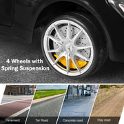 The ride-on car is equipped with a soft start system, providing a calm and gradual acceleration for a smooth cruise. The shock-absorbing wheels ensure a bump-free ride on various surfaces such as asphalt, tile, or brisk roads. The comfortable seats come with safety belts to keep the riders secure during their adventures.