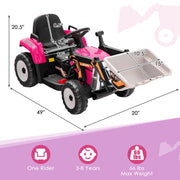The 12V Pink Battery-Powered Excavator with Adjustable Arm for Kids is the perfect holiday gift for your child this year. This unique ride-on toy features a realistic excavator appearance and cool headlights that will immediately capture your child's attention. They can pretend to be a construction worker and control the angle and height of the digging baskets to dig sand in the backyard, park, or playground.But that's not all! Our 12V Pink Battery-Powered Excavator offers two driving modes. Kids can drive the digger by themselves, or parents can use the 2.4G remote control to operate the car if their children are too young to drive independently. This ensures that both kids and parents can have fun with this rc ride on toy.To enhance the driving experience, this excavator is designed with a vivid horn, engine sound, and built-in music. Your child can also connect their mobile phone via the USB slot and wireless connection to play their favorite songs and stories while riding around.Safety is a top priority for us, which is why this electric construction vehicle is equipped with a safety belt, slow start technology, and wear-resistant and non-slip wheels. You can have peace of mind knowing that your child is safe while enjoying their ride-on adventure.The 12V Pink Battery-Powered Excavator is made with high-quality materials. It is constructed from PP and steel, ensuring durability and longevity. The comfortable seat provides a pleasant and enjoyable riding experience for your child.This ride-on toy has a weight capacity of 66 lbs and weighs 27.5 lbs. Its dimensions are 49" x 20" x 20.5" (L x W x H), making it the perfect size for kids to ride on.Assembly is required for this product, but don't worry, it's easy to put together. The set includes 1 x 12V Kids Ride on Excavator, 1 x 2.4G Remote Control, and 1 x Charger. You'll have everything you need to get your child's ride-on adventure started.The 12V Pink Battery-Powered Excavator with Adjustable Arm for Kids is a modern and stylish ride-on toy that can be used both indoors and outdoors. Its free-standing mount type allows for easy storage when not in use.Give your child the gift of adventure and imagination with the 12V Pink Battery-Powered Excavator with Adjustable Arm for Kids. Let them explore and create their own construction site with this fun and interactive ride-on toy.