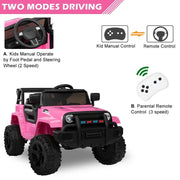 The 12V Pink Ride On Car Truck for Girls with 3 Speed Modes is the perfect gift for kids who love adventure and excitement. This amazing electric car is ASTM-certified and made with high-quality materials, ensuring safety and durability for your child's playtime. Whether they want to drive manually or use the remote control, parents can safely guide their child in this ride-on car.Key Features:- ASTM-certified and easy to assemble- Built-in horn and LED lights for added fun- Equipped with an MP3 player, radio, and USB Port to support MP3 format- 4 wheels with spring suspension ensure a super smooth ride- Automatic reset fuse provides protection for the circuit- Rechargeable 12V battery with included charger allows for hours of playtime- 2.4G remote control with 3 different speed modes, parking mode, and forward/reverse functionality- Easy to control for both parents and children's safety- Adjustable seat belt for safe and comfortable use- Recommended for children aged 3 to 6 years oldProduct Specifications:- Color: Pink- Material: PP Plastic, Metal- Seat Width: 12.8"- Seat Depth: 7.5"- RC Mode: 3 Speeds Options- Manual Mode: 2 Speeds Accessible- Maximum User Weight: 62 Lbs (28kg)- Speed: 2-4 KM/H (2.5 mph max)- Charge Time: 8-12 Hrs.- Run Time: 1-2 Hrs.- Wheels: 11”(Dia) Each- Battery Type: 12V 4.5AH- Controller Battery: 2 x AAA Batteries (not included)- Overall Dimensions: 39.4"(L) x 26.3"(W) x 26.3"(H)- Recommended for Ages: 3-6 yearsPackage Includes:- 1 x Electric Car- 1 x 2.4G Remote Control- 1 x Charger- 1 x ManualWith its vibrant pink color and exciting features, this remote control ride on car truck will provide endless fun and adventure for your little one. Let their imagination soar as they explore the world in their very own ride-on car. Don't miss out on this perfect gift for your child. Order now and watch their faces light up with joy!