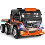 The 12V10AH Battery Kids Ride On Truck with Swing, Trailer, LED, MP3, and Bluetooth RC Features is the perfect ride-on toy for adventurous kids. With its three modes of operation, kids can have full control of the electric car using the pedals and steering wheel, experiencing the thrill of driving at two different speeds. Parents can also take control using the 2.4GHz remote control, which offers three speeds for added safety. But that's not all - this ride-on truck also comes with a swing function, allowing kids to enjoy a gentle back and forth motion as they ride. Featuring an officially licensed Mercedes-Benz MB Axor design, this toy truck comes with a detachable trailer that can carry up to 110lbs. The distinctive logo on the car body adds a touch of style to this already impressive ride-on. Whether kids choose to drive with or without the trailer, they'll have a blast exploring their surroundings and going on exciting adventures. Get ready for a fun-filled journey with the multiple and joyful functions of this ride-on truck. Equipped with a built-in AUX port, USB, TF slot, and Bluetooth, kids can listen to their favorite music and stories while driving. The high-bright LED lights add a cool factor, making nighttime driving even more thrilling. Your child will be the envy of the neighborhood as they cruise around in style. Safety is a top priority with this durable and safe design. Made of non-toxic PP and iron, this electric vehicle ensures the utmost safety and comfort for your child. The door comes with a safety lock, and the seat is equipped with a safety belt, providing peace of mind for parents. The wheels feature a spring suspension system, making them suitable for all kinds of roads, including asphalt, brick, and cement. With a 12V10AH large-capacity battery and two powerful motors, this ride-on truck is built to last. The battery comes with overcharge and overload protection, ensuring a long-lasting and safe playtime experience. Measuring at a large size of 56''x 28''x 26'', this truck can accommodate children of various sizes. With a speed range of 3-8km/h, kids can enjoy a thrilling and exhilarating ride. Surprise your child with the perfect gift for their birthday or Christmas. The licensed Mercedes-Benz kids truck with a trailer is sure to bring joy and excitement to their special day. Please note that the car will be divided into two packages, which may arrive at different times. Specifications: Color: Orange Battery: 12V10AH Charger: 12V1000mA Motor: 550-12000*2 Charge Time: 8-12 hours Loading Capacity: 66 lbs. (Trailer: 110lbs.) Speed: 3-8 km/h Max Loading: 66lbs Trailer Max Loading: 110lbs Size: 56''x28''x26'' Height Limit: 43.3'' Package Content: 1 x Electronic Ride On Car 1 x Hardware Bag 1 x Manual Instruction 1 x Remote Control