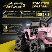 The 2-Seater 400W Electric Kids Ride-On Truck with Parent Remote Control - 24V is the perfect gift for adventurous boys and girls aged 3-8 years. With its realistic appearance and high-performance 24V 2x200W Motor, this ride-on truck is designed to provide a thrilling and safe driving experience. The parental remote control allows parents to take control when needed, while the wear-proof EVA tires and reinforced seat belt ensure maximum safety and comfort for your little ones. Featuring soft start and soft brake technology, electron-assisted steering wheel, auto-reset overheat protector, and upgraded spring suspension system, this ride-on truck is built to enhance the driving experience for experienced users. The 2 spacious large size seats provide ample space for two kids to drive together, encouraging shared driving fun and bonding. The 24V battery and 2x200W motors deliver more power and driving ability compared to the 12V version. With a full load, the large battery can last up to 120 minutes of uninterrupted driving. The ride-on truck offers two driving modes - parental remote control and kids manual operate - giving you the flexibility to choose the most suitable mode for your child. All functions of the ride-on truck are centrally controlled for convenience. The high-bright LED headlights, tail lights, and searchlights add a cool factor to the driving experience, especially at night. The built-in music system with AUX port, USB port, Bluetooth, and MP3 capabilities provides endless entertainment for your kids. This ride-on truck is made with high-quality non-toxic PP material and is certified by ASTM & CPSIA for safety. It features a lockable double door design, LED searchlight, metal suspension, and high chassis for added safety and durability. The 4PCS 14" EVA wheels equipped with a strong metal suspension system can bear a maximum load of 130 lbs. With its vibrant color options of Red, Pink, Black, and Green, this ride-on truck is sure to be a hit with your kids. The recommended age range for this truck is 3-8 years, and it measures 48.5 inches x 34.7 inches x 31.5 inches in overall size. The battery type is 24V 9AH, and the motor type is 200W*2. The ride-on truck has a safe speed range of 1.8-4.9 mph. Get ready to ignite your child's sense of adventure with the 2-Seater 400W Electric Kids Ride-On Truck with Parent Remote Control - 24V. Order now and let the fun begin! Key Features: Realistic appearance and high-performance 24V 2x200W Motor Parental remote control for added safety Wear-proof EVA tires and reinforced seat belt for maximum safety and comfort Soft start and soft brake technology for a smooth driving experience Electron-assisted steering wheel for easy maneuvering Auto-reset overheat protector for added safety Upgraded spring suspension system for a comfortable ride 2 spacious large size seats for shared driving fun 24V battery and 2x200W motors for more power and driving ability Two driving modes - parental remote control and kids manual operate High-bright LED headlights, tail lights, and searchlights for a cool driving experience Built-in music system with AUX port, USB port, Bluetooth, and MP3 capabilities Certified by ASTM & CPSIA for safety Lockable double door design for added safety Metal suspension and high chassis for durability 4PCS 14" EVA wheels with strong metal suspension system Recommended age range: 3-8 years Product Specifications: Color: Red / Pink / Black / Green Recommended Age: 3-8 years Material: PP and ABS plastic, Metal Battery Type: 24V 9AH Motor Type: 200W*2 Suspension: Full-Metal Suspension Seat Size: 18 inch Wheels Size: 14 inch Maximum User Weight: 130 lbs Safe Speed: 1.8-4.9 mph Charging Time: 8-12 hours Run Time: 100-120 minutes Music Function: AUX & USB port / Bluetooth / MP3 / Built-in music Overall Size: 48.5 inches x 34.7 inches x 31.5 inches