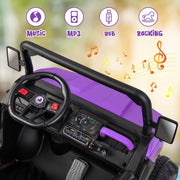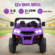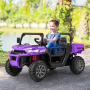 The 2-Seater Electric Dump Truck Ride-On for Kids with Remote Control - 12V is the perfect ride-on toy for adventurous kids who love trucks and construction. With its electric auto-lifting dump bed and extra shovel, children can experience the real joy of transport as they load up and deliver things just like a real dump truck. This remote control ride on car offers two driving modes for maximum flexibility. Kids can operate it themselves using the foot pedal, or parents can take control using the 2.4GHz remote. This allows for safe and supervised play, ensuring that children of all ages can enjoy the fun. But that's not all - this electric car for kids is packed with multiple attractive functions to keep them entertained. It comes with built-in music, a speed change switch, rocking mode, horn buttons, and a battery indicator. Plus, it has a USB, MP3 slot, and AUX so kids can play their own music and create their own driving soundtrack. Constructed of premium PP and iron materials, this ride-on car with remote control is stable and durable. It can withstand the rough and tumble play of active kids, with a maximum weight capacity of 110 lbs. Suitable for kids over 3 years old, it is designed to accompany them on their adventures for years to come. And you can rest easy knowing that this ride-on toy is DOE and CEC certification approved. It complies with the Department of Energy and California Energy Commission's electrical energy efficiency regulations, making it an energy-efficient and environmentally friendly choice. About Our Item Parents control mode by using a 2.4 GHz remote 4 wear-resistant wheels come with the rear suspension system Wide double seats with 2-point seat belt for cozy and safety Multimedia Panel including built-in music, AUX, USB, and MP3 port Made from premium PP and iron frame, strong and sturdy for long use Certified by ASTM ensures the safety of use, accompanies your child's healthy growth An automatic electric lifting dump bed with an extra shovel, for kids to enjoy loading up and delivering things Bright LED headlights and atmosphere lights, high-simulated steering wheel and dashboard offer a realistic driving experience Specifications Color: Purple Main material: Iron, PP Overall dimensions: 48" x 27" x 26" (L x W x H) Battery: 12V 7AH Net weight: 47 lbs Max weight capacity: 110 lbs Recommended for ages: 3+ Years old With its realistic design and exciting features, the 2-Seater Electric Dump Truck Ride-On for Kids with Remote Control - 12V is sure to provide hours of fun and adventure for your little ones. Get ready to watch their imaginations soar as they embark on thrilling ride-on adventures!