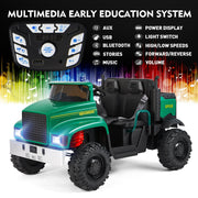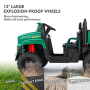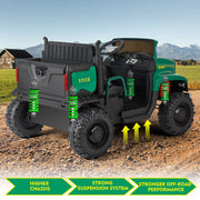 Product Description The 2-Seater Electric Ride-On Tractor with Dump Bed and 3-Speed RC - 24V Battery Powered Toy Car Introducing the 2-Seater Electric Ride-On Tractor with Dump Bed and 3-Speed RC - 24V Battery Powered Toy Car, a must-have for adventurous young drivers. Designed by JOYLDIAS, a brand that believes in creating a unique and exciting childhood experience, this ride-on toy car is perfect for children aged 3 and above. Whether it's for outdoor play or indoor fun, this ride-on tractor offers endless hours of entertainment and enjoyment. Key Features: TWO-SEATER RIDE ON TRUCK W/TRAILER - With an 18.5'' seat and 2 separate safety belts, this ride-on tractor allows two kids under the age of 4 or a child aged 7 or 8 to ride together, promoting shared play and double the fun. The tiltable trailer and lockable tailgate provide ample storage space for toys and snacks, enhancing the overall riding experience. TWO MODES TO OPERATE - Kids can take control of the electric car themselves using the pedals and steering wheel, experiencing the thrill of driving at 2 different speeds. Parents can also take charge using the 2.4GHz remote control, which offers 3 speed options for added safety and convenience. MULTIPLE AND JOYFUL FUNCTIONS - Equipped with a built-in AUX port, USB, TF slot, and Bluetooth, this ride-on tractor offers a variety of entertainment options for your child's driving journey. They can enjoy their favorite music while cruising around. The high-bright headlights add a cool factor, making night-time driving extra exciting. DURABLE AND SAFE DESIGN - Crafted from non-toxic PP and iron, this electric vehicle ensures durability and safety. The wheels feature a spring suspension system, making them suitable for various road surfaces, including asphalt, brick, and cement roads. PERFECT GIFT - Powered by 2 large-capacity 12V7AH batteries with overcharge and overload protection, this ride-on tractor is equipped with 2 powerful motors, ensuring a thrilling ride. With a large size of 47''x31''x27'' and a speed range of 4.5-5.5km/h, this 2-seater kids tractor toy is an ideal present for birthdays and Christmas. Product Specifications: Color: Green Battery: 24V (12V7AH*2) Charger Input: 100-240V Charger Output: 28.8V 500mA Motor: 200W*2 Charge/Use Time: Charge for 14 hours, use for 45-60 minutes Loading Capacity: 88 lbs Speed: 4.5-5.5 km/h Size: 47''*31''*27'' Height Limit: 43.3'' Package Content: 1 x Electronic Ride On Car 1 x Hardware Bag 1 x Manual Instruction 1 x Remote Control