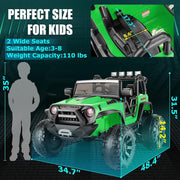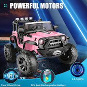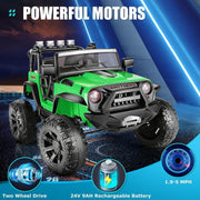 The 24V 2x200W Electric Ride-On Car for Kids with Remote Control - 2 Seater Let your kids drive in style with the Hikole 2-Seater Ride-On Truck. This electric ride-on car is the perfect gift for adventurous boys and girls. It provides a smooth riding experience with its 2-seater design and 24V power. The spring suspension systems ensure a comfortable ride on any terrain, while the one-button soft-starting technology allows for easy and safe operation. With three speeds up to 4.9 MPH, your child can enjoy hours of fun on this ride-on truck. It runs up to 120 minutes on a full charge and can switch between forward and reverse. Safety is a top priority with features such as manual and parental control, patented electron-assisted steering wheel with wheel auto-return, foot pedals, wear-proof tires, seat belts, and locking doors. The Hikole Kids electric car is suitable for all adorable kids, providing a safe and fun experience. Key Features: 2-Seater design Spring suspension systems One-Button-Soft-Starting tech 3 Speeds up to 4.9 MPH Runs up to 120 Mins on a Full Charge Switch forward and reverse Manual & Parental Control Patented Electron-assisted Steering Wheel & wheel auto-return Foot Pedals Wear-proof tires Seat belts Locking Doors Product Specifications: Color: Black/Green/Blue/Pink Size: 48.4"L x 34.7"W x 31.5"H Battery: 24V 9AH Power: 200W*2 Speed: 1.9-5mph Max Capacity: 110 lbs TIPS: Your car will come in two boxes, please make sure both boxes have been received before starting your assembly. Additional Specifications: Motor: 2*200 W Bluetooth Connectivity & USB Port Remote Control Realistic Design Adjustable Seat Belt 4-Piece LED searchlight, LED headlight Loading Capacity: 35 kg Age Level: 3-4 Years, 4-7 Years Motorized Easy-Drag Truck Remote control: AAA 1.5V Battery Working Time: Up to 2 hours Brand: Hikole Type: Electric Ride On Truck Bright LED Headlight, Lockable Double Doors Year: 2023 AUX Port, Silent Strong Motor Speeds: Low: 1.8mph, Middle: 3.0mph, Max: 4.9mph Battery: 24V 9AH Light-Sensitive Electronic Auxiliary Steering Wheel Theme: Cars Recommended Age Range: 3-8 Years Charger: 24V The Number Of Wheels: 4 Product size: 23x88x80cm (48.4x34.6x31.5in) Spring Suspension System Our children's electric car offers a smooth and comfortable ride with its four-wheel suspension. Let your child ride in comfort and style! Versatile Music Player Options Make driving fun with music, USB, AUX, and Bluetooth options on the Hikole 24V Ride-On Truck for Kids. Easy to Drag & Move This electric ride-on car comes with a retractable handle that's hidden in the rear, making it easy for parents to move around after their kids have finished playing. Dazzling Light Light up your child's adventure with the Hikole kids electric car, equipped with front and rear headlights and four LED spotlights. Perfect for adventurous kids who love exploring day or night!