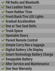 24V DUAL SEAT CHILDREN'S RIDE-ON VEHICLE JEEP CAR TOY WITH 2 HIGH-PERFORMANCE ENGINES, PNEUMATIC WHEELS, MUSIC PLAYER + REMOTE CONTROL The Battery Powered Two Seater 24V Power Children Electric Ride-On Truck Car is the ultimate ride-on toy for adventurous boys and girls aged 3-6 years old. With its sleek black color and car theme, this ride-on truck car is perfect for little ones who love cars and trucks. Key Features: Two-seater design for double the fun Removable large capacity 24V power battery with overload protection Two powerful custom 775 motors for an exciting ride Forward/Park/Reverse shifter switch for easy maneuverability Full function long range 2.4Ghz parental remote control with remote STOP function Soft start and electric brake system for gradual acceleration and reliable braking Upgraded drive train with 4 stage gearboxes using hybrid steel/nylon gears with bearings and powerful custom dual 775 motors Two-way adjustable soft perforated vegan leather seat with 2-way convertible safety seat belt Wide track zero maintenance EVA foam rubber tires with LED lights for traction and a comfortable quiet ride Realistic working LED headlights, LED light bars, tail lights, dashboard lights, and gauges Openable doors and hood for added realism Front and rear spring shock absorbers for a smooth ride Underbody soft glow blue LED light kit for a cool look Integrated Bluetooth MP3 player with wireless music streaming, FM radio, and AUX MP3 audio input Horn sound buttons on the steering wheel On-screen digital battery voltage meter Integrated handlebar for easy transportation without battery power Smart battery charging technology to prevent overcharging Requires assembly with an estimated assembly time of 45 minutes Battery charging time of 1-10 hours with automatically controlled charging Riding time per charge is 30-90 minutes depending on ride conditions Product Specifications: Color: Black, Pink, Red, Green Theme: Cars Recommended Age Range: 1 - 8 years Modified Item: No ASTM F963 Compliant Product (US Consumer Toy Safety Standards) Suitable for boys or girls 3-6 years old (under supervision of adult) with a maximum combined rider(s) weight of 100 lb 2 Seater Ride-On Truck Car for toddlers under 4 years or single rider 3-6 years old Assembled Dimensions: Length - 47", Height - 30.5", Width - 31" (With Wheels). Seat Width - 18.5", Seat Depth - 7.5", Dashboard to the back of the seat - 16" Max