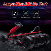 300W Electric Go Kart for Kids - Powerful Motors for Outdoor Drifting Fun! Description The 300W Electric Go Kart for Kids is the ultimate ride-on toy for outdoor drifting fun! With two extra large 300W motors, this go kart provides powerful motion, allowing your kids to reach a maximum speed of 8 MPH. The high/low speed switch gives your kids the option to choose between two different speeds. Safety is a top priority with the slow start function and seatbelt that keeps your kid secure. The go kart is designed for thrilling drifting experiences. It features two EVA front tires and two larger rear Nylon tires, providing excellent drifting effects. Your kids will love the S drifting and circling maneuvers they can perform with this go kart. The spacious seat, with a width of 14.3 inches, can accommodate a maximum load of 155 lbs (70KG), making it suitable for most kids and even some adults. Adding to the fun, the go kart comes with music and a horn. Your kids can drive with music and the horn gives them a real driving experience. They will feel like the coolest driver on the track. The go kart has a go kart design, powered by a 24V 9Ah battery and two brushless motors with a power output of 300W each. Its overall size is 43.3" L x 30.34" W x 21.18" H, making it the perfect birthday or Christmas gift for kids aged 8-12. Two 300W extra large motors provide powerful motion Maximum speed of 8 MPH High/low speed switch for different driving options Safety features include slow start function and seatbelt Two EVA front tires and two larger rear Nylon tires for excellent drifting effects Spacious seat with a width of 14.3 inches Maximum load of 155 lbs (70KG) Music and horn for a real driving experience Go kart design with a 24V 9Ah battery and two brushless motors Overall size of 43.3" L x 30.34" W x 21.18" H Suitable for kids aged 8-12 Battery: 24V 9AH Large Battery Motors: 2* 300W, 25000rpm (actual operating power varies in 250-350 watt range) Overall size: 43.3" L x 30.34" W x 21.18" H Max Load: 175lbs (70kg) Seat Width: 14.3", even spacious for an adult Speed: 3.7-8 MPH (low speed for normal driving, high speed for S Circling and Drifting) Front EVA tires + Rear Nylon tires: EVA tires for shock absorb, Nylon tires are more wear-resistant during drift
