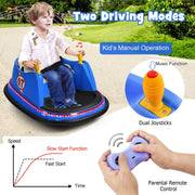 The 360° Spin Race Bumper Car Ride-On Toy for Kids with Remote Control - 12V Vehicle is the perfect gift for your child. With its ability to rotate 360°, this bumper car provides a thrilling and exciting ride-on experience for kids. It is designed to be suitable for various road surfaces, ensuring that your child can have fun wherever they go. The built-in music and colorful flashing lights add an extra level of excitement to the ride.Safety is our top priority, which is why this bumper car is equipped with a soft bumper and a slow start function. These features provide adequate protection for your child while they enjoy their ride. The car also comes with an adjustable seat belt to keep your child safe and secure.The 360° Spin Race Bumper Car can be controlled in two different ways. Your child can use the self-steer mode with the two rods provided, allowing them to have full control over the car. Alternatively, you can use the 2.4G parental remote control mode, which allows you to operate the car from a distance of 65.5 ft to 82 ft. This remote control mode ensures the security of your child.Key Features:- 360° Spin for free movement and great fun- Soft bumper offers protection for kids and walls- Remote control for parents to operate and control the direction- Adjustable seat belt keeps your child safe and secure- Quality wheels are suitable for different roads- Wide seat with backrest for comfortable seating- Spacious pedal area to hold your child's legs and feet- Upgraded 12V battery for powerful performance- Power switch for easy control, improving safety- Back charging hole ensures convenient chargingProduct Specifications:- Color: Blue/Pink/Red/Purple- Material: PP, Metal- Product Dimension: 22.5" x 29.5" x 16.5" (L x W x H)- Seat Size: 12.5" x 8.5" (L x W)- Battery: 12V 4.5A- Charger: 12V 500mA- Charging Time: 8-12 Hours- Speed: 1.3 mph- Maximum Weight: 44 lbs- Adaptable Age: 2-5 Years Old- Net Weight: 14.5 lbsPackage Includes:- 1 x Ride On Bumper Car- 1 x Remote Control- 1 x Charger- 1 x InstructionWith its 2 different ways to control and various entertainment features, the 360° Spin Race Bumper Car Ride-On Toy for Kids with Remote Control - 12V Vehicle from Honeyjoy is a modern and exciting remote control ride on bumper car. Its sturdy construction with PP and metal materials ensures durability and stability. The size of 22.5" x 29.5" x 16.5" (L x W x H) provides ample space for your child to enjoy their ride. The weight capacity of 44 lbs allows for a wide range of ages to enjoy this ride-on toy.This ride-on bumper car is a free-standing mount type, making it easy to set up and use both indoors and outdoors. The medium firmness of the car ensures a comfortable and enjoyable ride for your child. Assembly is required for this product, but the included instruction manual makes it easy to put together.Whether your child wants to ride around the house or have a fun adventure in the backyard, the 360° Spin Race Bumper Car Ride-On Toy for Kids with Remote Control - 12V Vehicle is the perfect choice. Its compact size and lightweight design of 14.5 lbs make it easy to transport and store. Give your child the gift of endless fun and excitement with this ride-on bumper car.