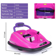 The 360° Spin Race Car for Kids with Remote Control and LED Lights - 6V Bumper Car Ride-On is the ultimate ride-on toy car for your adventurous little ones. This fully rechargeable and powered bumper car can spin a full 360 degrees with simple joystick controls, providing endless excitement and fun. Designed for children aged 3 to 8 years, this 6V electric spinning car features a maximum speed of 1.24mph, ensuring a thrilling ride while maintaining safety. The bumper car is equipped with a full surround protective design and a safe belt, keeping the body balanced and steady during playtime. One of the standout features of this remote control ride on car is the built-in music and colorful flashing LED lights. These vibrant lights enhance the fun quotient and create a captivating visual experience for your child. The 360-degree spin capability of this bumper car adds an extra element of excitement and joy to your child's playtime. They can enjoy thrilling spins and turns, making every ride a memorable adventure. For added safety and peace of mind, this bumper car offers two driving modes. Younger children, aged 3 years, can use the remote control feature, allowing parents to control the car and ensure their child's safety. Older children can drive the car independently, developing their motor skills and coordination. Safety is paramount with this bumper car. It is designed to run at a speed of 2km/h (1.24 mph) and features a soft bumper that acts as a cushion during bumping games, protecting both the car and the child. The car also includes an adjustable safety belt and a sturdy plastic shell with anti-flat wheels. This bumper car is suitable for most indoor and outdoor surfaces, including wooden, tile, concrete floors, and thin carpets. Your child can enjoy endless playtime and adventures with this versatile ride-on toy. In addition to its impressive features, this bumper car also offers personalized DIY options. It comes with free stickers that your toddler or child can use to customize their new ride. The stickers include four sets of 0-9 numbers, allowing your child to add their own personal touch to the car. Specifications:- Brand: Kimbosmart- Theme: Cars- Character Family: Bumper Car- Age Level: 3-4 Years- Year: 2022- Recommended Age Range: 3 to 6 years old- Contents of the package: 1x Ride-on Bumper Car, 1x Remote Controller, 1x User Manual, 1x Charger, 1x Number Stickers- Type: Ride-on Bumper Car- Color: Red, Black, Pink, Green- Material: PP and Iron- Motor: 25W- Weight Capacity: 66 lbs- Charge Time: 8-12 hrs- Speed: 2km/h- Battery: 6V 4AH- Overall Dimension: 29.9*25.2*17.7 inch- Seat size: 13"W x 8"D- Assembly Required: YesGet ready for endless fun and excitement with the 360° Spin Race Car for Kids with Remote Control and LED Lights - 6V Bumper Car Ride-On. Let your child's imagination run wild as they embark on thrilling adventures with this incredible ride-on toy. Order yours today and watch your child's face light up with joy!
