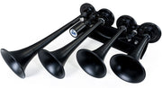 Discover the commanding presence of the HornBlasters 4-Chime Air Horn, a perfect blend of robust sound and sleek aesthetics. This air horn comes in a stealth black finish that complements any vehicle and is equipped with a pre-installed 1/4" 12-volt air valve for seamless integration with your onboard air system.