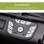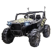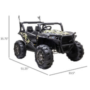 The 4WD Kids Truck with Parental Remote Control and Powerful Quad Motors Add a new addition to your child's garage with this dynamic remote control ride on off-road kids truck from Aosom. This truck is designed to provide an incredible driving experience for your young one, featuring both in-car and remote-control steering. With its powerful 12V twin motor, wing mirrors, working headlights and taillights, steering wheel, foot pedal, and forward/reverse gears, this truck offers endless fun and adventure. Let your child's imagination run wild as they cruise in this realistic UTV vehicle. The truck is equipped with 2 wide seats, complete with safety belts, allowing two kids to ride together. The four 15.75" traction wheels with spring suspension ensure a smooth and comfortable ride, even on rough terrains. The twin motor provides powerful rear-wheel drive, giving your child the thrill of a real off-road adventure. The truck is packed with exciting features to enhance the driving experience. It has working lights, mirrors, and a steering wheel with a horn for added realism. There are two cup holders behind the seat, perfect for holding drinks during the ride. The pre-installed music and multi-media center, along with USB/TF/Bluetooth input and aux cord plug-ins, allow your child to enjoy their favorite tunes while driving. The 4WD Kids Truck can be controlled using the steering wheel or the 2.4GHz remote control, giving parents the option to take over if needed. It has a continuous driving time of up to 45 minutes, depending on speed and use, ensuring hours of non-stop fun. Key Features: 2 wide seats with safety belts, allowing two kids to ride together Four 15.75" traction wheels with spring suspension for a smooth and comfortable ride Twin motor provides powerful rear-wheel drive Working lights, mirrors, and steering wheel with horn for added realism Two cup holders behind the seat for convenience Pre-installed music and multi-media center with USB/TF/Bluetooth input and aux cord plug-ins Can be controlled with the steering wheel or the 2.4GHz remote control Drives continuously for up to 45 minutes depending on speed and use Specifications: Color: Camouflage Green Material: Plastic Metal Overall Dimension: 51.25" L x 33.5" W x 35.75" H Seat Size: 20.5" L x 7.75" W x 11.75 "H Speed: 1.8 - 5 mph Weight Capacity: 77 lbs Battery: 12V 10AH Motor: 35W x 2 Charger: 12V 1000Ma Recommended Ages: 3-8 years old Certifications: ASTM F963 CPSIA Net Weight: 61.5 lbs Note: Always monitor your child while they are riding.