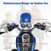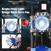 The 6V Toddler Electric Motorbike with Horn & Headlights - Perfect for Indoor and Outdoor Play! is not just an ordinary ride-on toy. With its attractive chopper-style design, this motorbike will instantly captivate the attention of your little ones. Its cool appearance sets it apart from other ordinary motorcycles, making it a standout choice for adventurous kids. The 3-wheel design ensures a stable driving experience, preventing any chance of falling over. Plus, the kids-friendly seat with a backrest takes comfort to the next level, allowing your child to ride in style and comfort.One of the key features of this motorbike is its bright headlight, which not only adds to the cool factor but also brightens up the surroundings in the darkness. The headlight is adjustable, allowing your kids to customize their driving experience. To make the ride even more enjoyable, this motorbike is equipped with built-in music, ensuring that your little ones never get bored during their exciting adventures.Operating this motorbike is a breeze. Simply turn on the general power button, choose the forward or reverse mode, and press the foot pedal. Thanks to its rechargeable design, this motorbike offers longer driving time after a full charge, allowing your kids to have endless fun without the need for manual effort. Charging the motorbike is also a simple process, making it convenient for both kids and parents.Whether your kids want to ride indoors or outdoors, this motorbike is up for the challenge. Its wear-resistant wheels allow for smooth riding on various surfaces such as brick roads, wood floors, asphalt grounds, and even plastic runways. With nearly no limitations of space, your kids can enjoy their happy driving time freely, unleashing their imagination and exploring new territories.This chopper-style motorbike is not just a toy; it's a perfect gift to surprise your kids. It creates fond childhood memories that both parents and kids cherish. The motorbike is also made with safety in mind, as it is crafted with materials that are certified by ASTM, ensuring its reliability and durability.Why Buy Our Item?- Eye-catching chopper-style motorcycle design that stands out from the rest- 3-wheel structure for higher stability and safety during rides- Wide seat with a kids-friendly backrest for maximum comfort- Direction-adjustable headlight for added fun and visibility in the dark- Built-in music to keep your kids entertained during their adventures- Simple operation with power button, forward/reverse switch, and foot pedal- Rechargeable motorbike that is easy to charge through a socket- Suitable for various types of ground, including brick roads, asphalt, and wood floors- Crafted with safe materials and certified by ASTM for peace of mind- Perfect toy to accompany your boys or girls and create lasting childhood memoriesSpecifications:- Color: Blue- Material: PP, iron- Dimension: 36" x 19" x 25" (L x W x H)- Speed: 2.5-3 km/h- Battery: DC 6V, 4.5AH- Net weight: 14 lbs- Weight capacity: 66 lbs- Recommended age: 3+ years oldWith the 6V Toddler Electric Motorbike with Horn & Headlights, your kids will embark on thrilling ride-on adventures like never before. Get ready to witness their excitement and joy as they explore the world around them with this incredible motorbike.