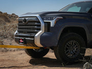 Add dedicated front recovery points to your Toyota Tundra. aFe POWER Tow Loops mount directly to the frame and are much safer than the factory tie-down loop when towing or recovering a stuck vehicle. The 3/4 IN solid steel loop is designed to safely withstand and distribute heavy loads allowing access to several recovery attachments for a strong and durable recovery point. Powder-coated red so they are easily recognized in the elements during off-road adventures. aFe POWER front tow hooks are constructed from 3/16 IN laser-cut, CNC machined steel brackets, and 3/4 IN solid steel bar. MIG welded for strength and durability. Bolts Directly onto the frame, using the front sway bar mounts with no drilling or modifications. Retains the front sway bar use while clearing the Active Aero front spoiler and factory bumper. (Patent Pending)