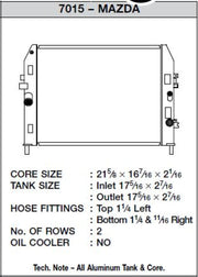 CSF has over 5 decades of experience manufacturing radiators. So when it comes to keeping your engine cool and your NC Miata running at its best, a CSF High-Performance All-Aluminum Radiator is the obvious choice. Designed to perform on the street or at the track, a performance radiator is a must-have for both high horsepower builds as well as race vehicles which need added cooling performance in motorsports environments. This radiator features a 2-Row core with CSF's exclusive B-Tube Technology: Unlike a regular oval shape "O" type radiator tube, CSF uses a specially engineered tube in the shape of a "B". These "B-tubes" are carefully formed and then brazed over the seam to seal. CSF is able to use thinner and lighter aluminum material (with better cooling efficiency) because this design is actually stronger than normal "O" shape tubes that are welded. The design (inlet in the middle of the tube that is seam brazed) increases the heat transfer surface area of the tubes by approximately 15% over regular tubes - producing the efficiency of two smaller tubes vs. one large tube within the same space criteria. With "B-tubes" you are able to get "dual liquid laminar flow". CSF also uses ultra efficient multi louvered fins that are carefully and precisely aligned to maximize airflow through each radiator core. Fin specifications are carefully measured and calculated for each application, and tested for maximum heat rejection efficiency in our wind-tunnel lab.