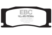EBC Yellowstuff is an aramid fibre based brake compound with high brake effect form cold and is possibly one of the first ever compounds that can be used for STREET AND TRACK DRIVING. These pads do not require warm up but do get even stronger under the heat of hard driving. These are not a low dust pad and if your desire is for a low dust premium street use pad, you should consider EBC Redstuff.When considering full race use, Yellowstuff has been a strong favourite, having been used for two years in the Swedish Camaro Cup and at numerous other race events where a stock caliper system is fitted.It is also the choice of 90-percent of the Mazda MX5 Miata competitors in the UK race series and has an unblemished record as rotor friendly track pad for vehicles up to 2000 lbs weight or 200 BHP.In the USA the SCCA and NASA drivershave been testing Yellowstuff with feedback and good reports POURING in from a 543 test driver major market proving event with these groups. Read that figure again 543 test drivers.There is no guesswork here.