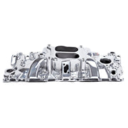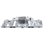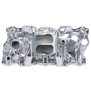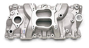 Edelbrock part #21041 Performer intake manifold is designed for street 262-400 c.i.d. Chevy V8's that have heads with canted center bolt holes, 1987-1995. Both accept late-model water neck, air-conditioning, alternator, H.E.I. and have rear water crossovers. This intake manifold accepts exhaust-heated chokes. For 1987-95 stock aluminum heads use #2101. Will not fit Chevrolet Bowtie or LT1 heads. This manifold offers a polished finish for a brilliant shine and classic look.
