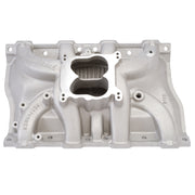 Edelbrock part #2115 Performer Cadillac intake manifold is designed for 1968-76 Cadillac 472 and 500 cubic-inch engines. For either square or spread-bore carbs, this is the first intake designed specifically for high-performance Cadillacs using standard heads. Like all Edelbrock Performers, this manifold increases torque and horsepower from idle to 5500 rpm. The broad power band is ideal for high-performance's street and engine swap applications. Specs on this non-EGR manifold include a carb pad height that's 3" taller than stock. Dropped divider wall evens air/fuel ratio throughout the rpm range. Stock air conditioning compressor will not fit.