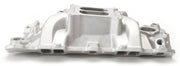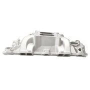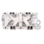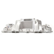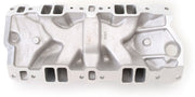 Edelbrock part #7101 Performer RPM intake manifold is designed for 1955-86 262-400 c.i.d. Chevy V8's for maximum power and a broad torque curve for high- Performance'street/marine engines. Provides power like a single-plane and throttle response like a dual-plane. Has provisions to machine for an oil fill tube. No provisions for exhaust heated or stock-style choke. Accepts late-model water neck, air-conditioning, alternator and H.E.I. Will fit cast iron Chevrolet Bowtie heads, but will not fit 1987 and later cast iron heads. Intake manifolds will not fit under stock Corvette hood.