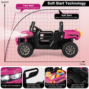 The Electric 2 Seater UTV Dump Truck with Remote Control and Functional Dump Bed is the perfect ride-on toy to create unforgettable childhood memories for your little ones. With its realistic tractor appearance, bright LED headlights, and rearview mirrors, this ride-on truck offers an immersive and realistic driving experience for kids. Operating the dump truck is a breeze - simply press the power switch, push the shift lever, and step on the foot pedal to make the car move forward, backward, or stop. The automatic dumping and lifting gear box, along with the openable tailgate and shovel, will surely capture your child's attention. But the fun doesn't stop there! This off-road UTV is equipped with cheerful music and horn sound, providing unlimited entertainment during the ride. Plus, the USB, MP3, and phone connection functions allow for even more entertainment options. Safety is our top priority, and parents can rest assured that our 12V battery-powered dump truck is both safe and reliable. The spring suspension system effectively absorbs shocks and minimizes impact, ensuring a smooth and comfortable ride. The seat is equipped with a safety belt for enhanced protection, and the soft start and stop technology prevents sudden acceleration or braking, keeping your child safe and comfortable. For added convenience, parents can control the ride-on UTV freely with the included 2.4G remote control. Key Features: Tiltable dump bed can dump or lift automatically by the dump switch The tailgate can be opened if needed Large dump bed to store various kid’s toys, sands, fallen leaves, etc. The shovel is easy to be fixed on the shovel holder 2 seats and 110 lbs weight capacity for 2 young kids Odorless PP material and sturdy steel for great durability Built-in music, aux input, USB port, and wireless connection for endless fun The truck can move back and forth when you press the “rocking mode” button 2.4G remote control has 3 optional speeds and emergency brake button One-start button, forward/stop/reverse lever, and foot pedal for easy operation Adjustable safety belt and lockable doors keep children safe in the seat Soft start technology ensures safer and more comfortable driving experience 4 wear-resistant wheels and suspension springs for a smooth ride The media center displays remaining battery power Product Specifications: Color: Pink/Blue Material: PP, Steel Overall Dimension: 46.8" x 26.7" x 25.5" (L x W x H) Size of the Dump Bed: 19.5" x 8" x 4.5" (L x W x H) Weight Capacity: 110 lbs Net Weight: 47.5 lbs Suitable Age: 3-8 Years Max Speed: 2-5 mph (3-8 km/h) Recharge Time: 8-12 Hours Battery: 12V 7AH Battery Type of the Remote Control: 2 x 1.5V AAA Battery (Not Included) Get ready to embark on exciting adventures with the Electric 2 Seater UTV Dump Truck with Remote Control and Functional Dump Bed. Order yours today and let the fun begin!