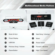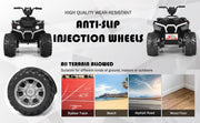 The Electric 4-Wheeler ATV Quad Ride On Car for Kids with LED Lights and Music - White is the perfect ride-on toy to accompany your kids on their adventurous journeys. With its sleek design and bright LED headlights, this ATV will light up the dark surroundings, adding an extra element of excitement to their playtime. Safety is a top priority with this ride-on ATV. It features a slow start function that ensures a stable and protected driving experience for your little ones. The wide seat is designed to fit well with their body shape, providing the utmost comfort during their rides. Operating this ATV is a breeze for kids. They simply need to turn on the power switch, choose between the high or low driving speeds, and select the forward or reverse direction using the corresponding switch. The steering wheel is equipped with horn sound and simulative acceleration sound buttons, giving them a realistic driving experience. To keep the fun going, this electric ATV has a rechargeable battery that allows for long hours of driving after a full charge. The power display reminds you to recharge it in time. There are also several music and story options available to entertain your kids and prevent boredom. The built-in USB slot function provides even more resources for endless fun. No terrain is off-limits for this ATV. It is equipped with wear-resistant wheels that allow your kids to ride on various surfaces such as the beach, rubber track, cement road, and more. Whether they choose to ride indoors or outdoors, the four wheels with a large diameter provide great stability. Crafted with high-quality materials and certified by ASTM, this ATV ensures reliable usage and durability. It is available in a stylish white color that will surely catch the attention of your little ones. Why buy our item? - The slow start function ensures perfect performance in driving stability, providing higher protection for your kids. - The variable high/low speeds offer different driving experiences for endless fun. - The music and stories bring much more excitement to their driving adventures, dispelling any hint of boredom. - The horn sound and simulative acceleration sound buttons create a realistic driving experience. - The built-in USB slot function allows for numerous resources to enhance their playtime. - The kids-friendly seat provides higher driving comfort. - The bright LED headlights not only add to the fun but also light up the surroundings. - The wear-resistant wheels combine lasting durability and higher stability. - This ATV can ride on various terrains including the beach, rubber track, cement road, wood floor, and more. - It is made with selected materials for reliable usage and is certified by ASTM for enhanced reliability. Specifications:- Color: White- Material: PP, iron- Dimension: 42" x 25.5" x 29" (L x W x H)- Net weight: 36.4 lbs- Weight capacity: 77 lbs- Speed: 2.8-5 km/h- Battery: 12 V / 7AH- Charger: 12 V- Charging time: 8-12 hours- Running time: 1-2 hours- Suitable age: 3-7 years oldBrand: CostwayTheme: CarsAge Level: 4-7, 8-11 Years